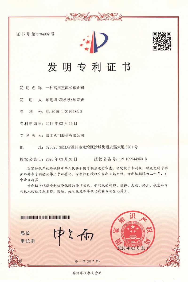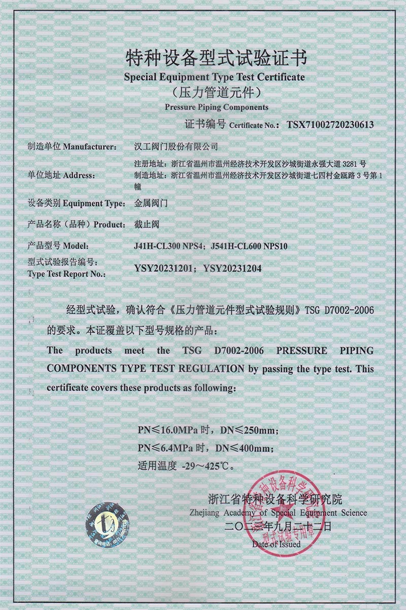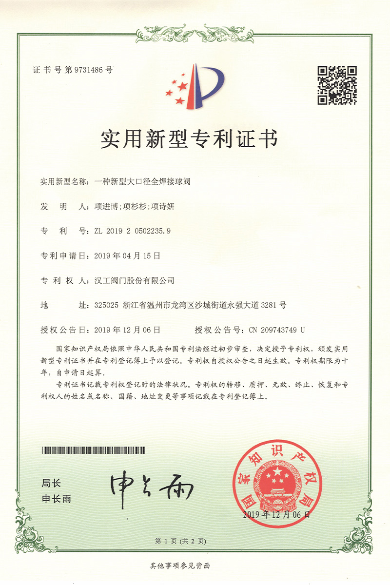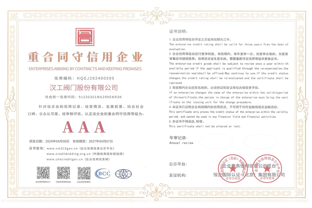 公司先后通過了ISO9001:2008國際質(zhì)量管理體系認證,ISO4001:2004環(huán)境管理體系認證,GB/T28001-2001職業(yè)健康安全管理體系認證,中華人民共和國特種設備制造許可認證(TS),中國石油和石油化工設備工業(yè)協(xié)會團體會員單位,中國化工集團公司合格供應商成員單位,中國華電集團公司集團級供應商成員單位,中國華能集團公司供應商,中國城市燃氣協(xié)會團體會員,中國建筑金屬結(jié)構(gòu)協(xié)會會員單位,中國著名品牌等這一系列的質(zhì)保體系是漢工閥門在設計、開發(fā)、制造、銷售、服務于一體的后盾力量,確保了漢工閥門的質(zhì)量與品牌。